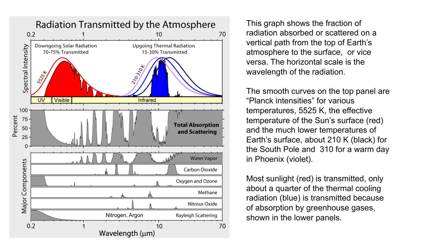 There’s a lot of blocking of radiation in total. The amount that makes it through FROM the sun is the RED area at the Left of the 1st Frame. The amount of energy re-radiated to space at night is the BLUE area at about 11 micro-meter frequency.